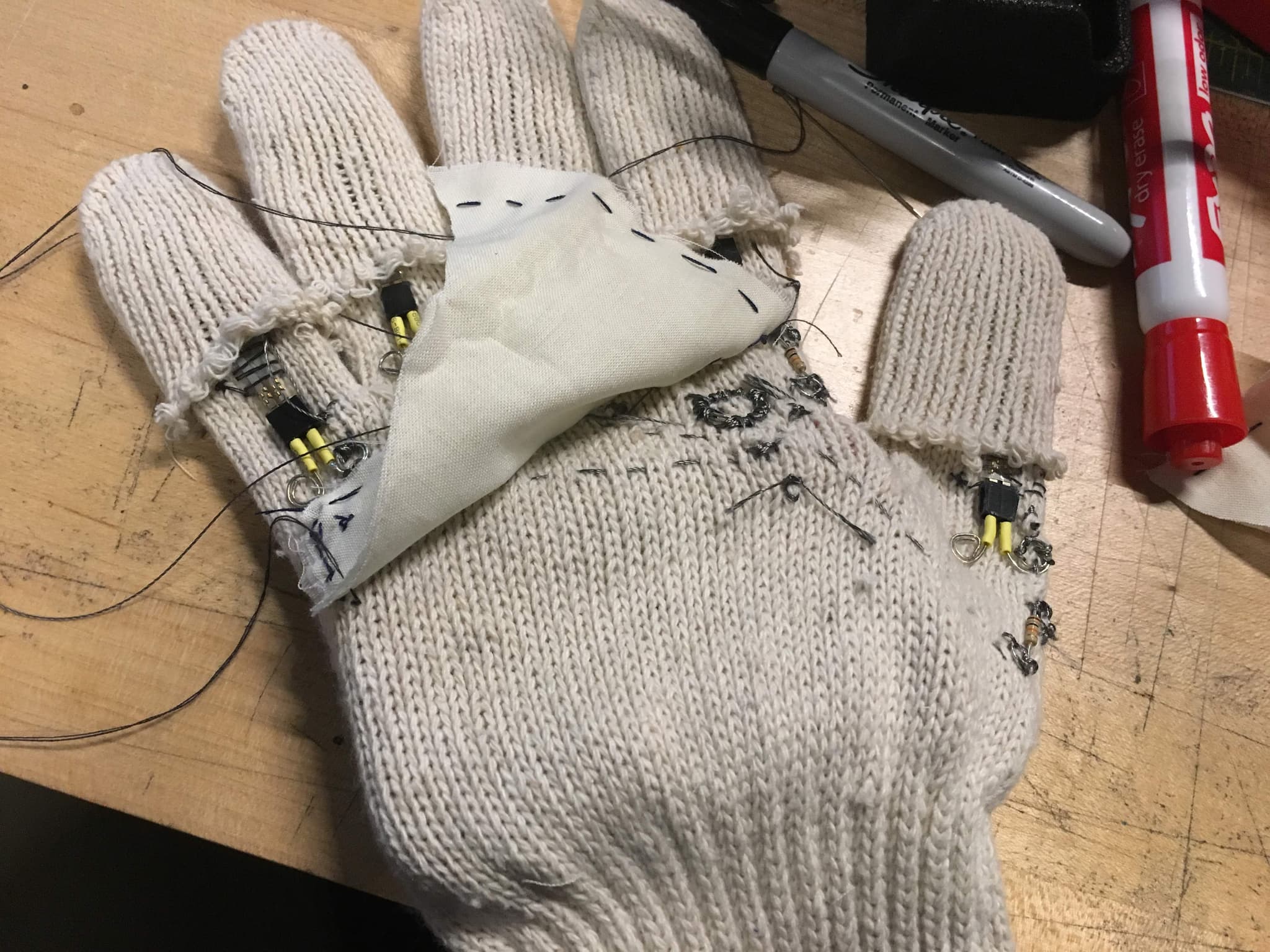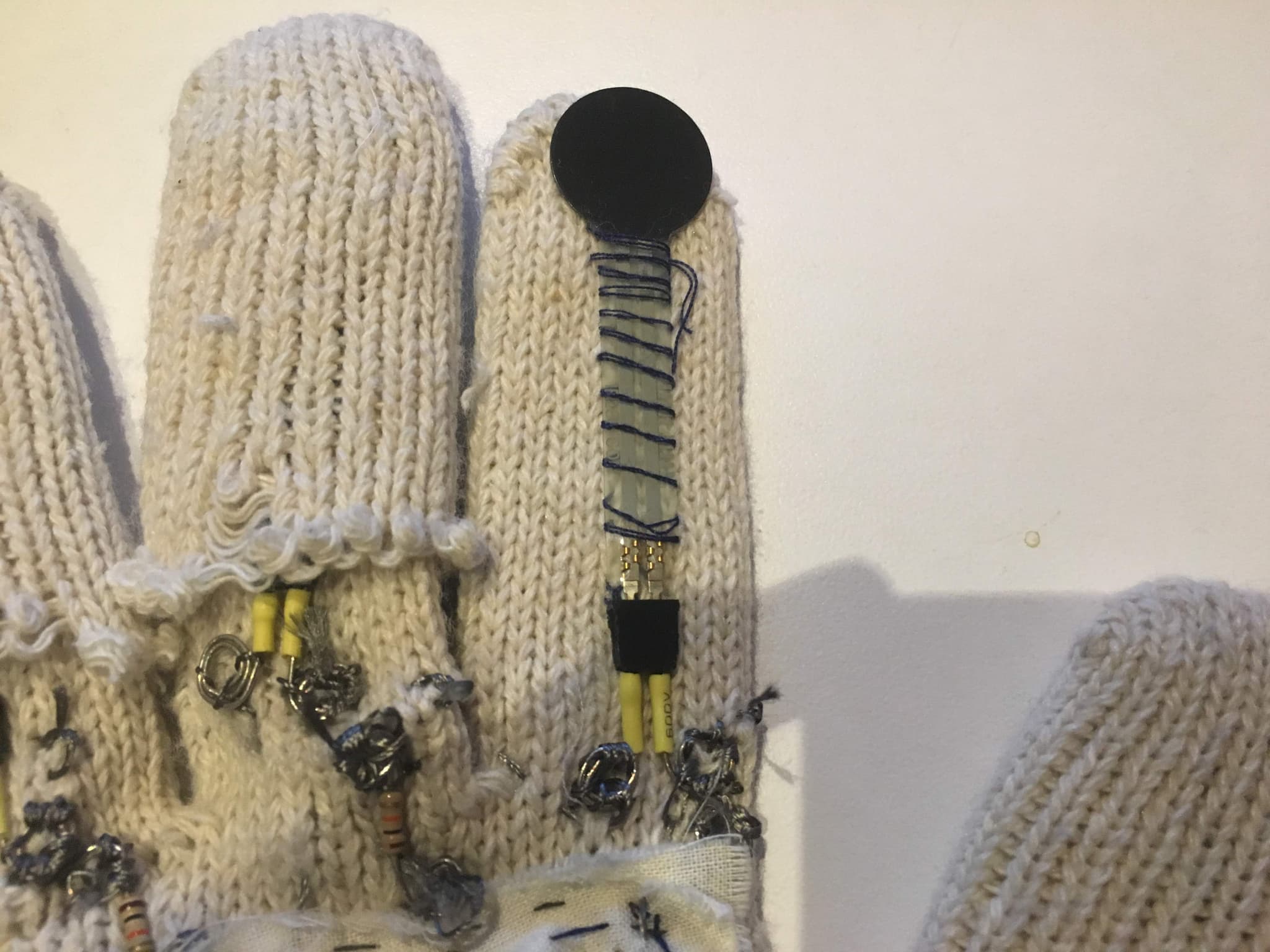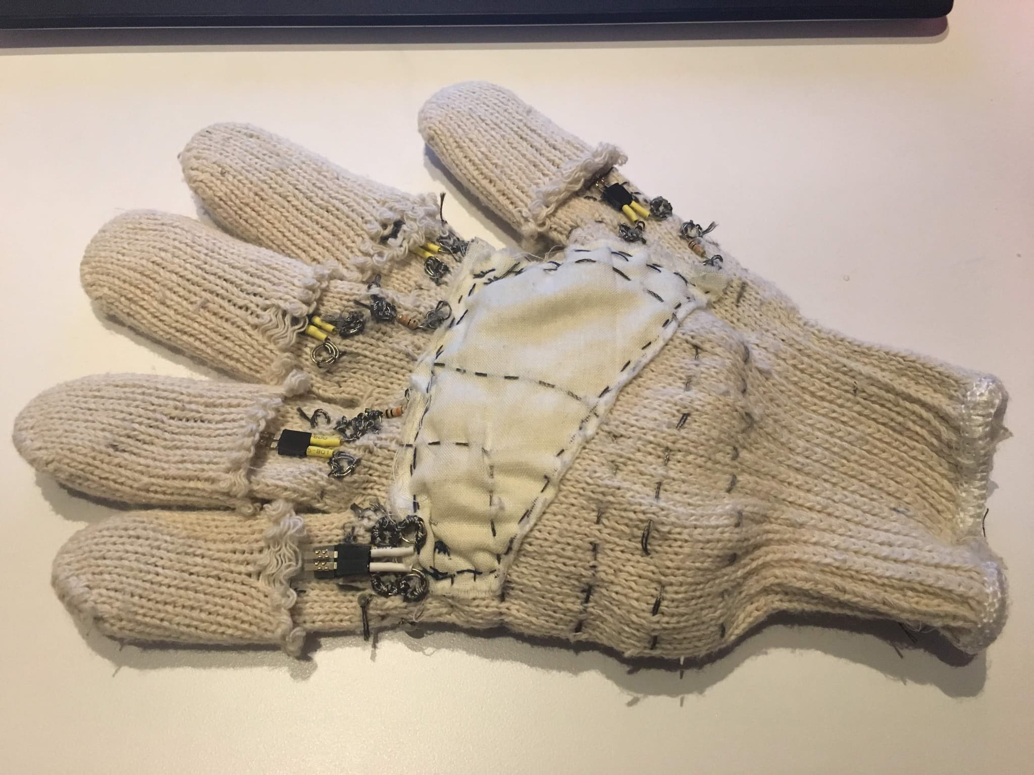 FSRs (force-sensitive resistors) are pressure-based sensors which have a variable resistance value that changes based on the force applied. In this project, I used five sensors total, one on each finger. These sensors are connected to the microcontroller and lithium polymer battery via conductive thread, interwovern through the glove.