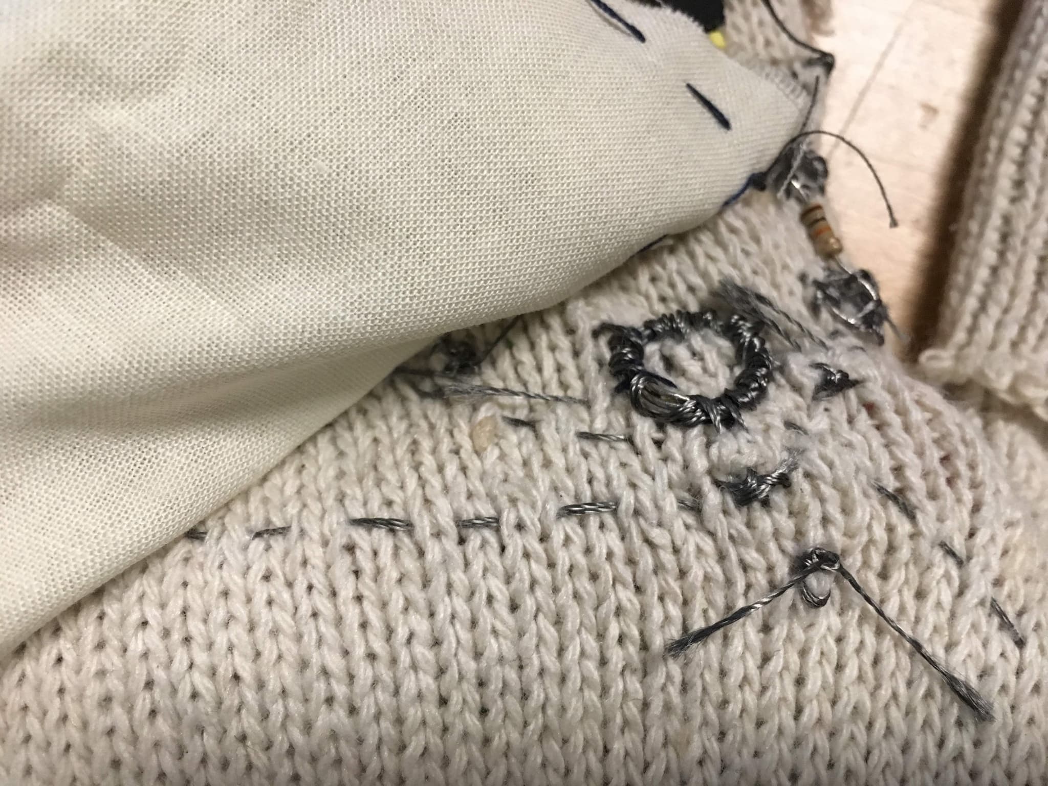 Created with: Adafruit ESP8266 Feather microcontroller, FSR sensors, 10kΩ resistors, LiPo battery, conductive thread.